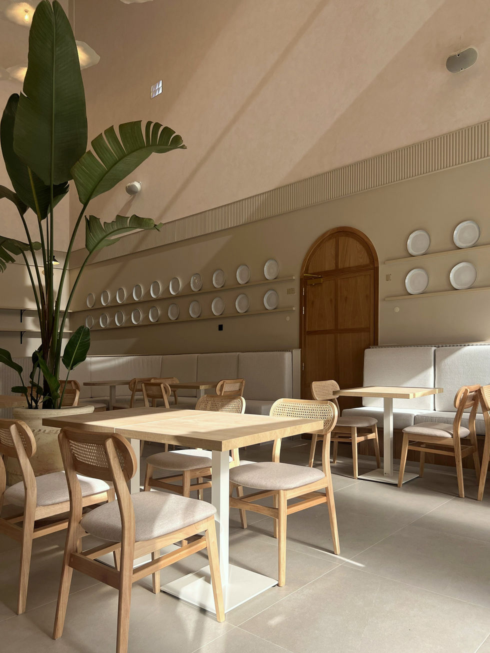 A utilização de materiais naturais, com destaque para a madeira, aliada à escolha de candeeiros suspensos, permitiu equilibrar a escala do espaço e conferir maior acolhimento a um pé-direito elevado. O resultado é um espaço harmonioso, convidativo e coerente com o contexto envolvente.